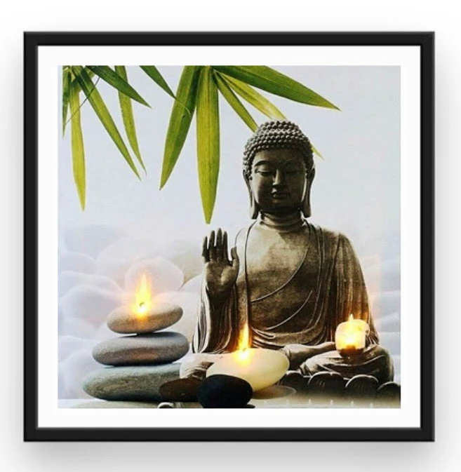 LE TRÈS CÉLÈBRE BOUDDHA MÉDITE PAISIBLEMENT AUPRÈS DE BOUGIES ET DE GALETS RELAXANTS. SI VOUS AUSSI VOUS SOUHAITEZ PASSER UN MOMENT ZEN ET DÉTENTE, DANS CE CAS CETTE BRODERIE DIAMANT EST IDÉALE… COLLEZ VOS STRASS ET AMUSEZ-VOUS, TOUT EN CRÉANT UNE DÉCO ANTI-STRESS.