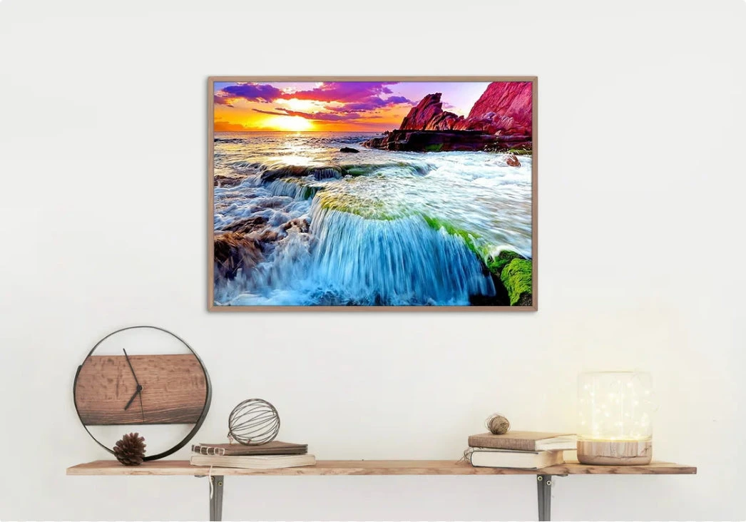 L’eau translucide qui se jette dans la mer est tout simplement magnifique, sans oublier le coucher de soleil chaleureux en second plan. Que diriez-vous de coller vos strass sur cette Broderie Diamant Cascade & Coucher de Soleil ? Une aubaine conçue pour les brodeurs et brodeuses à la recherche de paysages uniques.