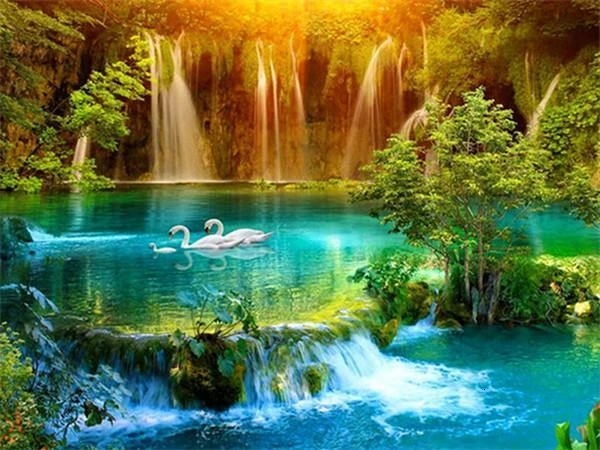 ÉMERVEILLEZ VOS PUPILLES DEVANT CETTE MAGNIFIQUE CASCADE ! CE PETIT COIN DE PARADIS REPRÉSENTÉ SUR UNE BRODERIE DIAMANT UNIQUE EN SON GENRE, EMBELLIRA VOTRE INTÉRIEUR AVEC SES CYGNES ET SES FAISCEAUX DE LUMIÈRE.