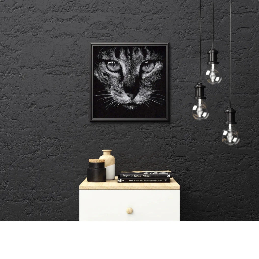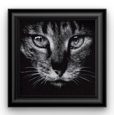 CE CHAT TAPISSÉ DANS L’OMBRE NOUS FIXE D’UN REGARD PERÇANT… CET ANIMAL DE LA FAMILLE DES FÉLINS EST UN REDOUTABLE PRÉDATEUR, MAIS QUI TOUTEFOIS SAIT VIVRE EN COHABITATION AVEC L’HUMAIN. CETTE BRODERIE DIAMANT SOMBRE EST UN ÉLÉMENT DE DÉCORATION UNIQUE ET DESIGN.