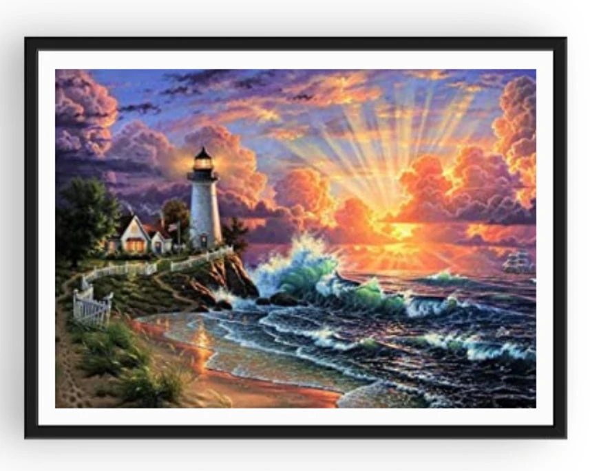 QUE DÎTES-VOUS DE CE COUCHER DE SOLEIL SUR UN DÉCOR DE MER AGITÉE ? ON Y APERÇOIT AUSSI UN PHARE ET UNE CHOUETTE MAISONNETTE. CETTE BRODERIE DIAMANT DE PAYSAGE PLAIRA AUX PETITS COMME AUX GRANDS, MAIS SURTOUT VOUS DONNERA UNE VÉRITABLE OEUVRE D’ART À ACCROCHER CHEZ VOUS !