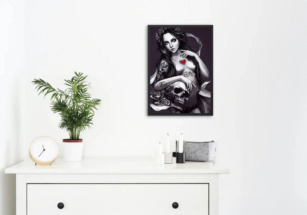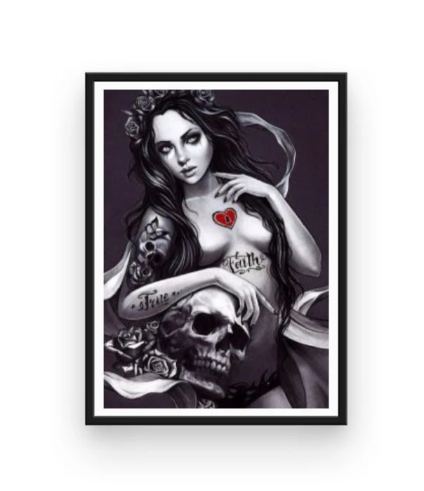 Les tatouages rock’n’roll de cette femme ainsi que le crâne présent à ses côtés lui donnent un aspect trash et biker. Créez la Broderie Diamant Crâne et Femme et faites ressortir votre côté anti conformiste. Les strass brillants vous feront oublier vos tracas quotidiens… À broder sans modération !