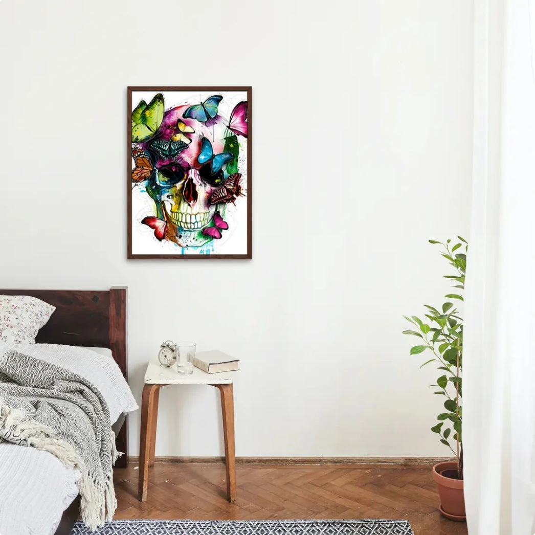 La Broderie Diamant Crâne et Papillons est très appréciée par les amoureux de décoration d’intérieur et de design. En effet admirez le résultat final sur un mur de votre maison, et imaginez à quel point ces papillons colorés apportent la touche parfaite de couleur à ce crâne d’humain.