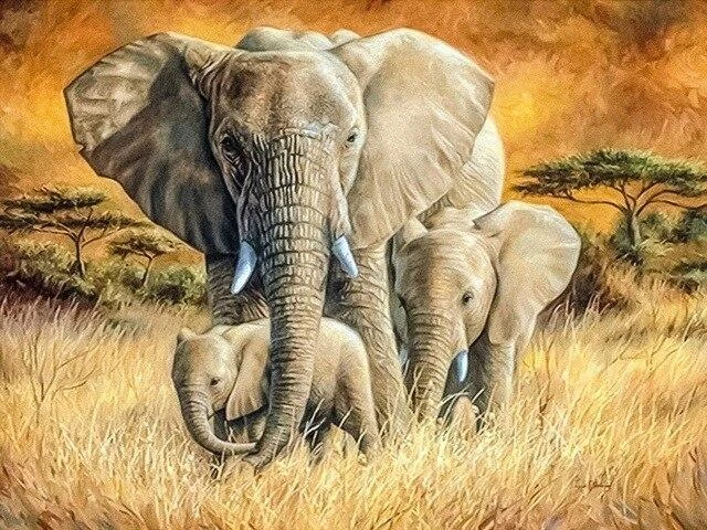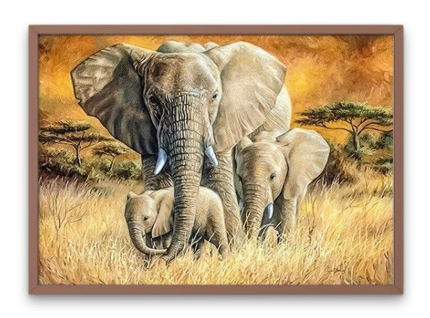 QUOI DE PLUS BEAU DANS LA VIE QU’UNE FAMILLE D’ANIMAUX ? CES ÉLÉPHANTS ONT L’AIR DE VIVRE PAISIBLEMENT DANS LA SAVANE. IL NE MANQUE PLUS QUE VOUS ET VOS STRASS BRILLANTS POUR RECOUVRIR TOTALEMENT CETTE BRODERIE DIAMANT ! UNE DÉCO GÉNIALE ET UN CADEAU UNIQUE.