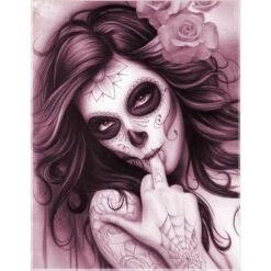 OSEZ CETTE SPLENDIDE BRODERIE DIAMANT REPRÉSENTANT UNE FEMME DÉGUISÉE POUR LA FÊTE DES MORTS MEXICAINE ! SON CÔTÉ REBELLE VOUS PLAIRA-T-IL ? EN TOUT CAS, L’UNIVERS DES TÊTES DE MORT PRÔNE SUR CETTE TOILE.