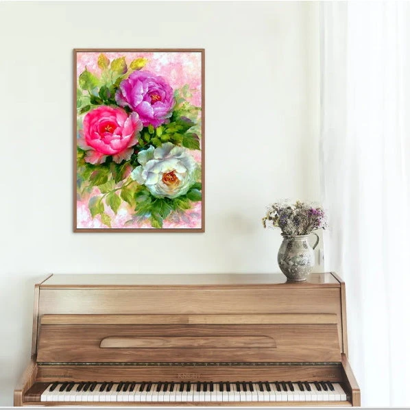 TROIS JOLIES PIVOINES SONT REPRÉSENTÉES SUR CETTE SUPERBE BRODERIE DIAMANT. LA PREMIÈRE EST BLANCHE, SYMBOLE DE PURETÉ, PUIS UNE SECONDE QUE L’ON APERÇOIT EN ROSE QUI NOUS FAIT PENSER À L’AMOUR. ET POUR FINIR LA DERNIÈRE FLEUR EST ROUGE QUI NOUS RAPPELLE VRAIMENT L’AMOUR PROFOND… CETTE TOILE N’ATTENDS QUE VOUS !