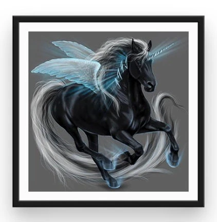 DES AILES BRILLANTES, UNE ALLURE ÉLANCÉE ET UNE ROBE NOIRE… VOICI LA BRODERIE DIAMANT LICORNE SOMBRE ! CET ANIMAL MYTHIQUE EST HABITUELLEMENT VÊTU D’UN BLANC ÉCLATANT TRÈS PUR, MAIS PAS SUR CETTE TOILE… QUOI QU’IL EN SOIT : LES STRASS SERONT AUSSI BRILLANTS ET ÉCLATANTS, ET BIEN SÛR ILS N’ATTENDENT QUE VOUS POUR UN MOMENT RELAXATION INTENSE.