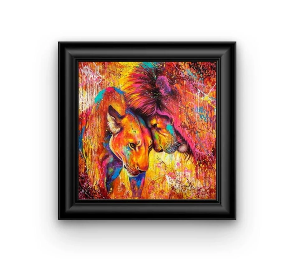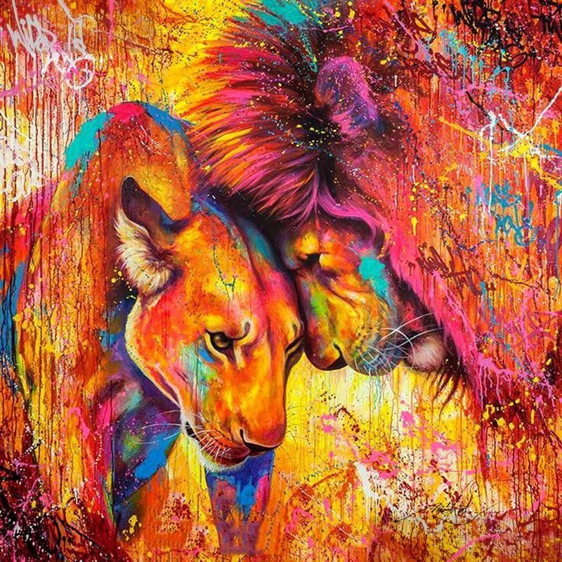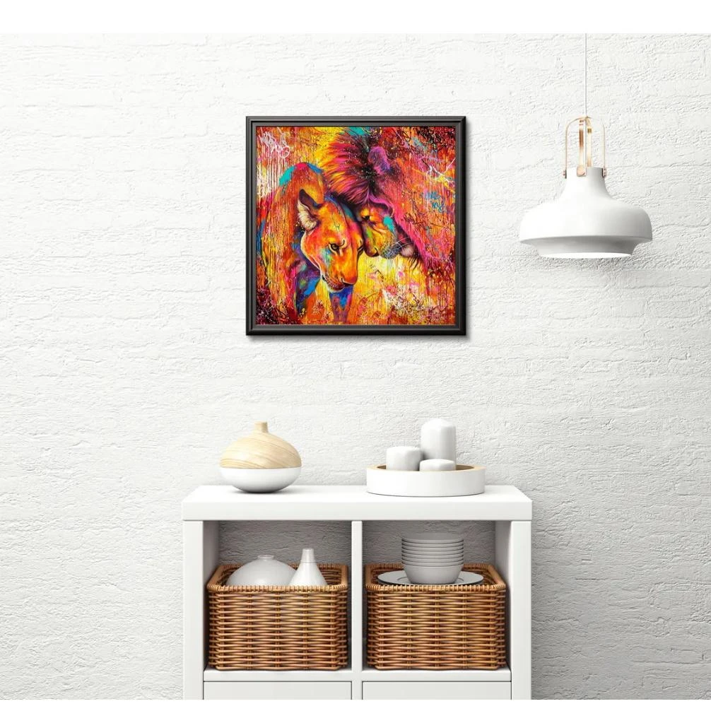QUOI DE PLUS JOLI QUE TOUTES LES COULEURS DE L’ARC-EN-CIEL RÉUNIES SUR UNE JOLIE TOILE ? ET EN PLUS CETTE EXPLOSION DE COULEURS REPRÉSENTE LE MAJESTUEUX LION ET SA LIONNE. CETTE BRODERIE DIAMANT EST À BRODER CHEZ SOI, PUIS À ACCROCHER !