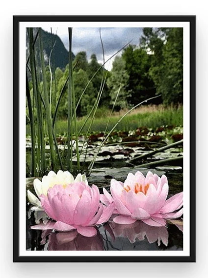 CETTE BRODERIE DIAMANT INCARNE LE RENDU D’UNE VÉRITABLE PHOTOGRAPHIE DE PROFESSIONNEL. CELA EST UN ÉLÉMENT DE DÉCORATION IDÉALE ET TRÈS RÉALISTE, QUI REPRÉSENTE DE MAGNIFIQUES LOTUS AUX TONS ROSES… DE PLUS, L’ARRIÈRE PLAN D’EAU ET DE VERDURE DONNE UN MÉLANGE DE COULEURS PARFAIT POUR Y COLLER VOS STRASS ET VOUS DÉTENDRE !