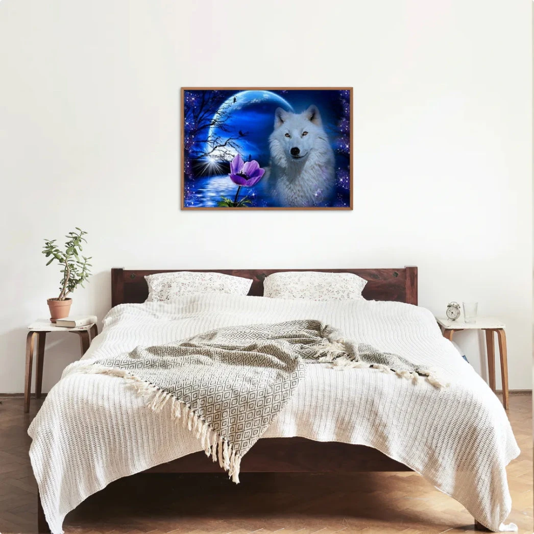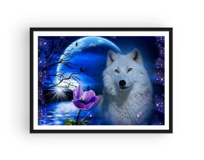 Ce majestueux loup blanc pose devant le clair de lune brillant, et une fleur violette qui apporte une touche de couleurs à cette toile… Confectionnez sans plus attendre la Broderie Diamant Loup Blanc et passez un moment unique avec l’animal le plus solitaire que nous connaissons. Les bords de cette œuvre sont parsemés d’étoiles brillantes, une aubaine pour la créativité et l’aspect décoratif de cette œuvre !