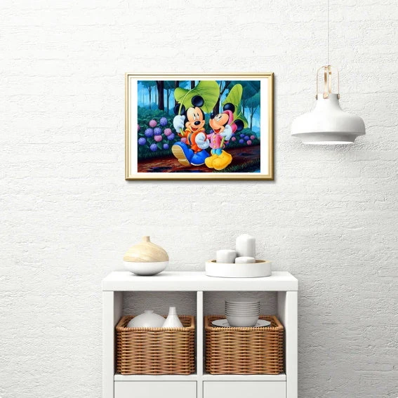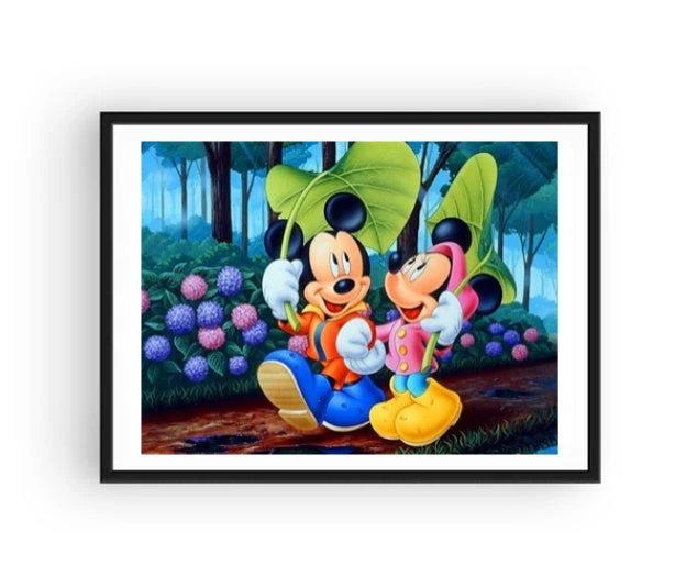 ATTENTION AUX FLAQUES D’EAU ! MICKEY ET SON AMOUREUSE MINNIE SE BALADENT EN FORÊT SOUS LA PLUIE… AVEC EN GUISE DE PARAPLUIE UNE FEUILLE D’ARBRE ! CETTE BRODERIE DIAMANT SYMPATHIQUE VA APPORTER UNE TOUCHE DE JOIE ET DE LIBERTÉ CHEZ VOUS. QU’ATTENDEZ-VOUS POUR Y POSER VOS MILLE ET UNS DIAMANTS BRILLANTS ? UNE ACTIVITÉ CRÉATIVE COMME ON LES AIME.