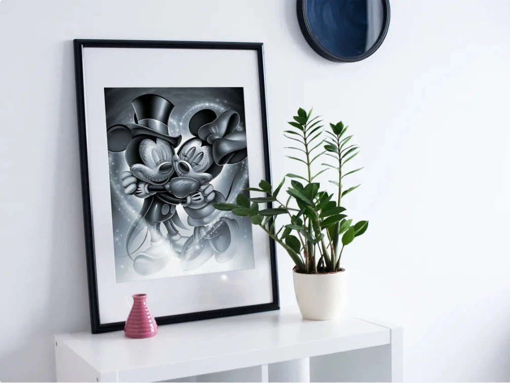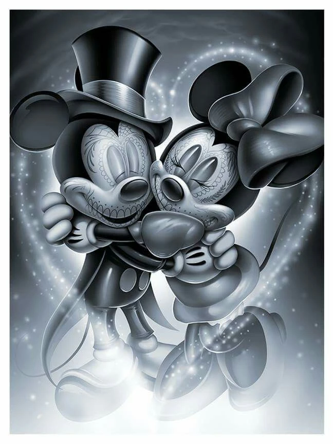 NOS DEUX SOURIS PRÉFÉRÉES TIRÉES DE L’UNIVERS DISNEY SE FONT UN GÉNÉREUX CALIN… NOUS POUVONS LES VOIR MAQUILLÉS À LA MEXICAINE, COMME LA FAMEUSE FÊTE DU JOUR DES MORTS « DÍA DE LOS MUERTOS ». CETTE BRODERIE DIAMANT EST DONC UN MÉLANGE D’AMOUR ET DE MÉLANCOLIE ACCENTUÉE PAR SES COULEURS AUX NUANCES DE GRIS. VENEZ Y POSER VOS DIAMANTS BRILLANTS !