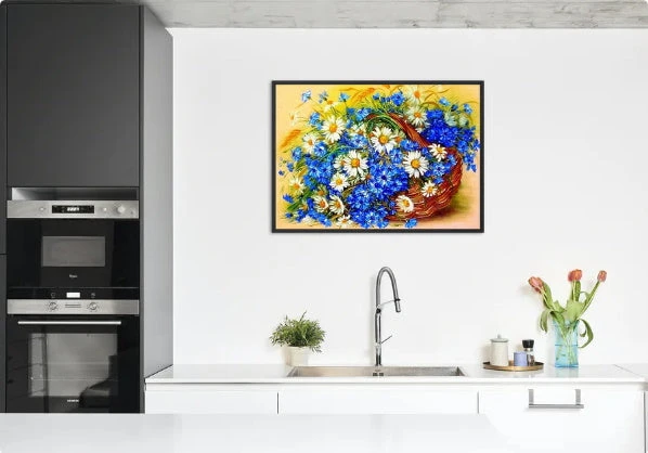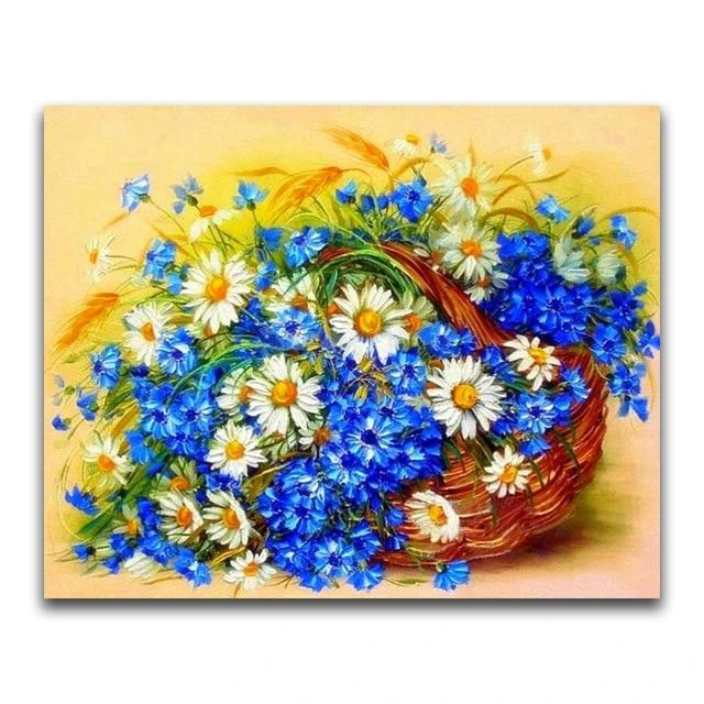 LA MARGUERITE QUI EST SYMBOLE DE PURETÉ ET D’ÉLÉGANCE, EST REPRÉSENTÉE ICI AUX CÔTÉS DE JOLIES FLEURS BLEUES DANS UN BOUQUET EN OSIER. L’ARRIÈRE PLAN JAUNÂTRE FAIT RESSORTIR LES COULEURS DE CE DÉCOR FLEURI ET NOUS DONNE ENCORE PLUS ENVIE D’Y POSER NOS DIAMANTS BRILLANTS… CETTE BRODERIE DIAMANT N’ATTEND PLUS QUE VOUS.