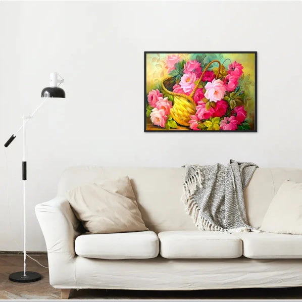 DES JOLIES FLEURS ROSES DANS UN PANIER EN OSIER. CETTE MAGNIFIQUE BRODERIE DIAMANT AUX FLEURS HARMONIEUSES ET COLORÉES VOUS FERA PASSER UN SUPER MOMENT LORS DE LA CONFECTION. POUR LES AMOUREUX DE LA NATURE, N’ATTENDEZ PLUS : MUNISSEZ-VOUS DE VOS OUTILS ET DIAMANTS, ET COMMENCEZ TOUT DE SUITE CETTE TOILE…