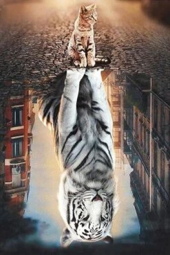 CE MIGNON PETIT CHAT BLANC AUX RAYURES NOIRES SERA BIENTÔT UN GRAND FÉLIN ADULTE ET FÉROCE. DU MOINS C’EST AINSI QU’IL SE VOIT DANS SON REFLET… UNE SUPERBE BRODERIE DIAMANT POUR PASSER UN MOMENT EXQUIS DE CONFECTION ET DE DÉTENTE. ARMEZ VOUS DE VOS DIAMANTS ÉTINCELANTS ET CONFECTIONNEZ CETTE TOILE AVEC AMOUR.