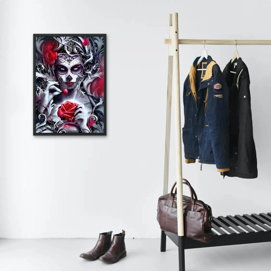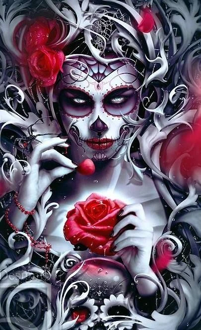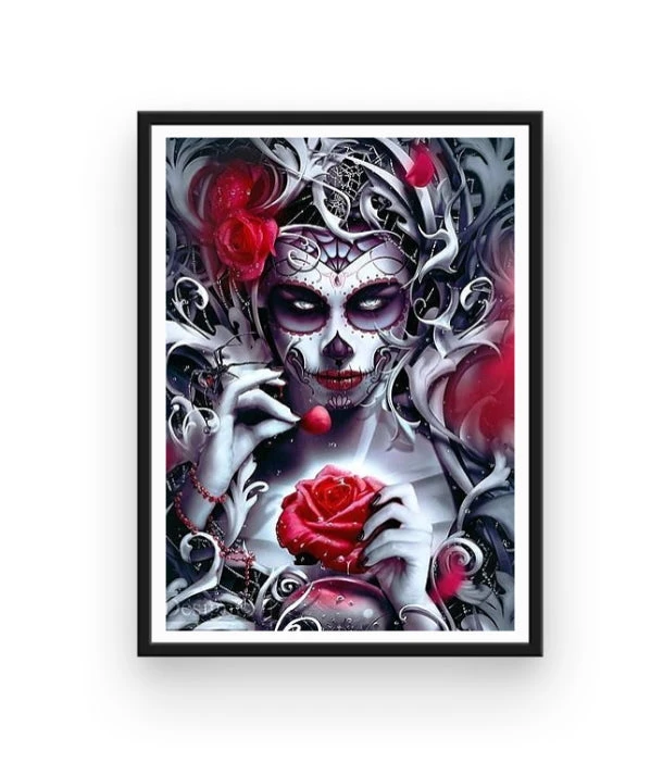 La reine de l’au delà vous fixe avec son regard ténébreux… Prenez garde ! Avec son maquillage calavera et sa rose rouge entre ses mains, cette femme dirige le royaume des morts. La Broderie Diamant Reine de la Mort est une toile idéale pour les brodeurs et brodeuses en quête de sensations fortes, et de relaxation par la même occasion.