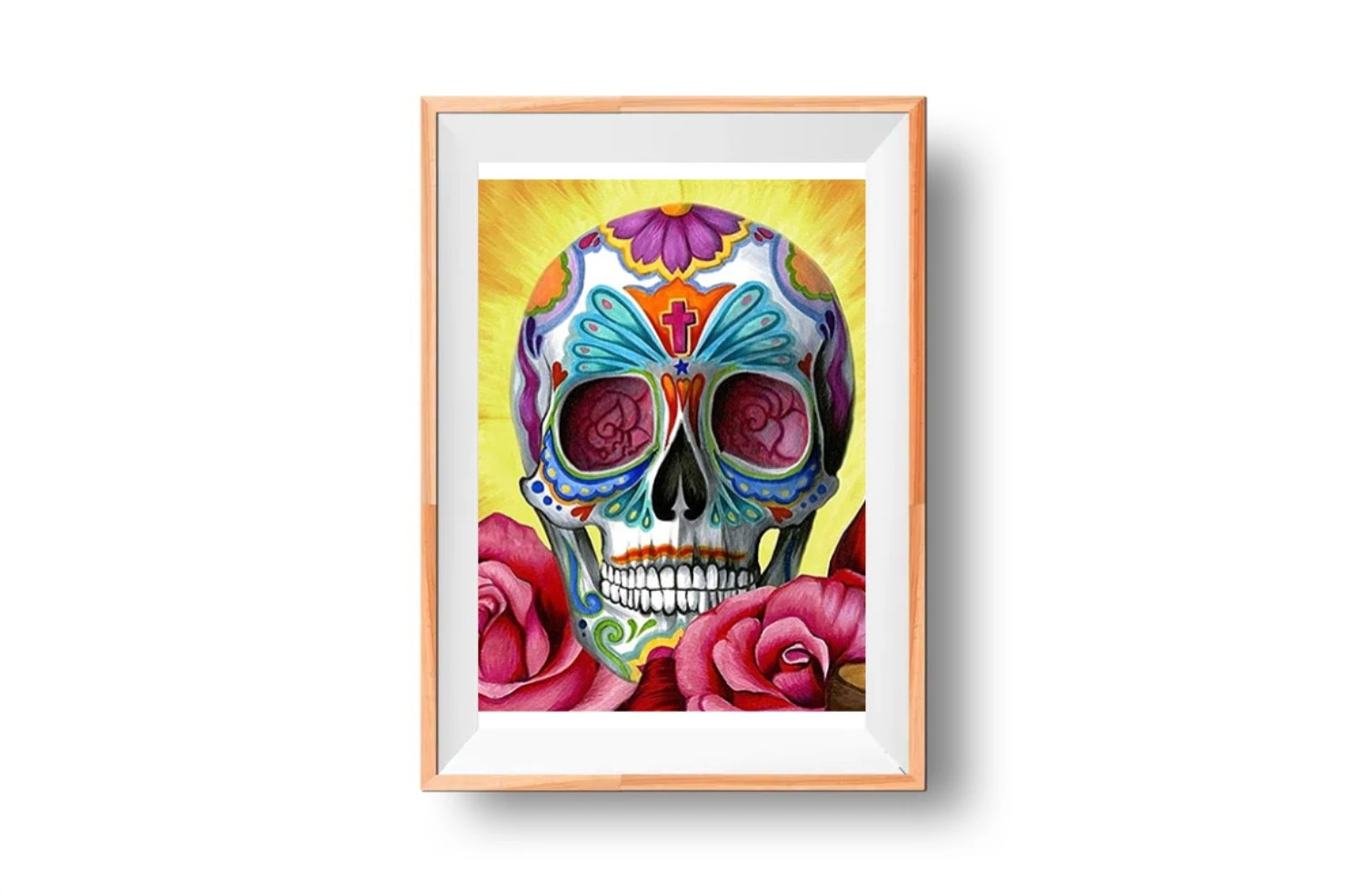 LA LÉGENDAIRE « CALAVERA », PLUS COMMUNÉMENT APPELÉE TÊTE DE MORT MEXICAINE, EST ICI TRÈS COLORÉE ET TRÈS FLEURIE ! CETTE TRÈS JOLIE BRODERIE DIAMANT FAIT L’UNION PARFAITE ENTRE LA MORT ET L’AMOUR.