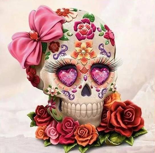 Ce crâne humain est orné de décorations colorées : fleurs, nœud papillon, et même diamants roses… Une véritable œuvre d’art vous est présentée avec la Broderie Diamant Tête de Mort et Roses ! Collez vos stras étincelants et célébrez los dias de los muertes comme il se doit… Relaxation garantie.