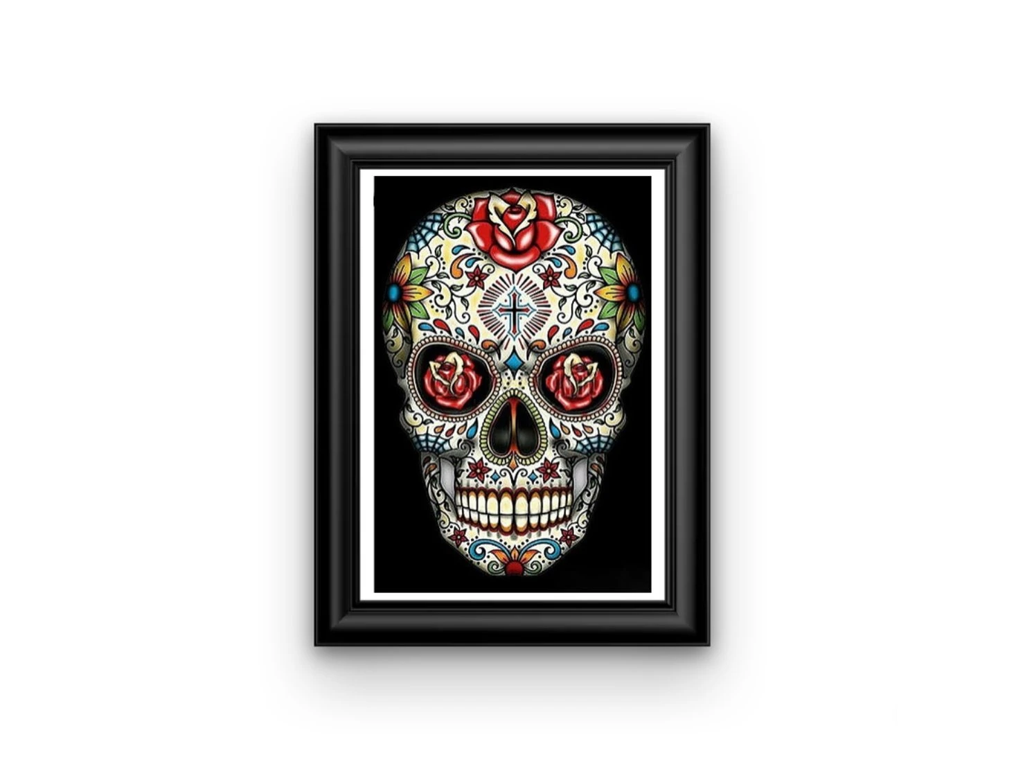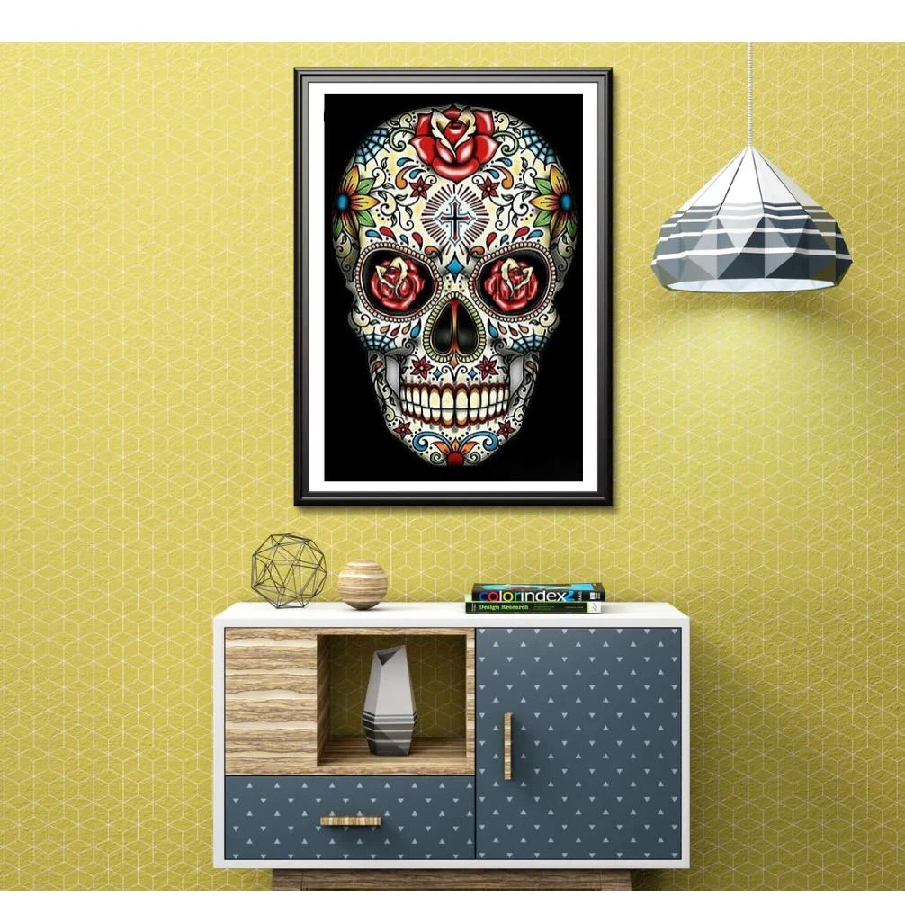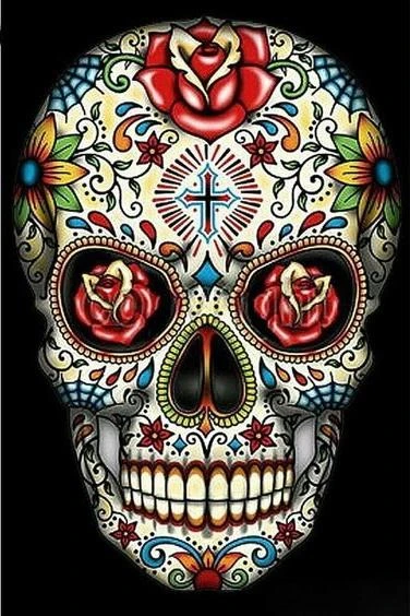 LA LÉGENDAIRE « CALAVERA », PLUS COMMUNÉMENT APPELÉE TÊTE DE MORT MEXICAINE, EST ICI REPRÉSENTÉE SUR CETTE MAGNIFIQUE BRODERIE DIAMANT. ÊTES-VOUS PRÊT POUR LE JOUR DES MORTS COMME IL SE DOIT ?